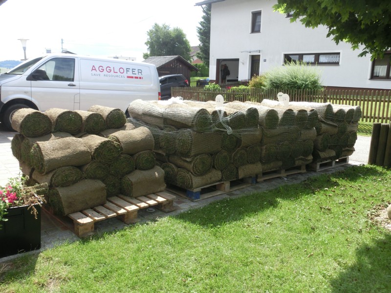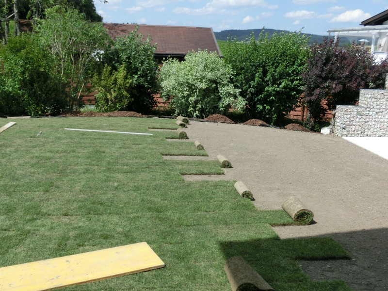 Wenn es schnell grün werden soll.Auf vorbereiteten, feinplanierten Boden, werden die frisch angelieferten Rasensoden verlegt und anschließend angewalzt und gut eingewässert. Der Rasen ist sofort begeh- und bespielbar.